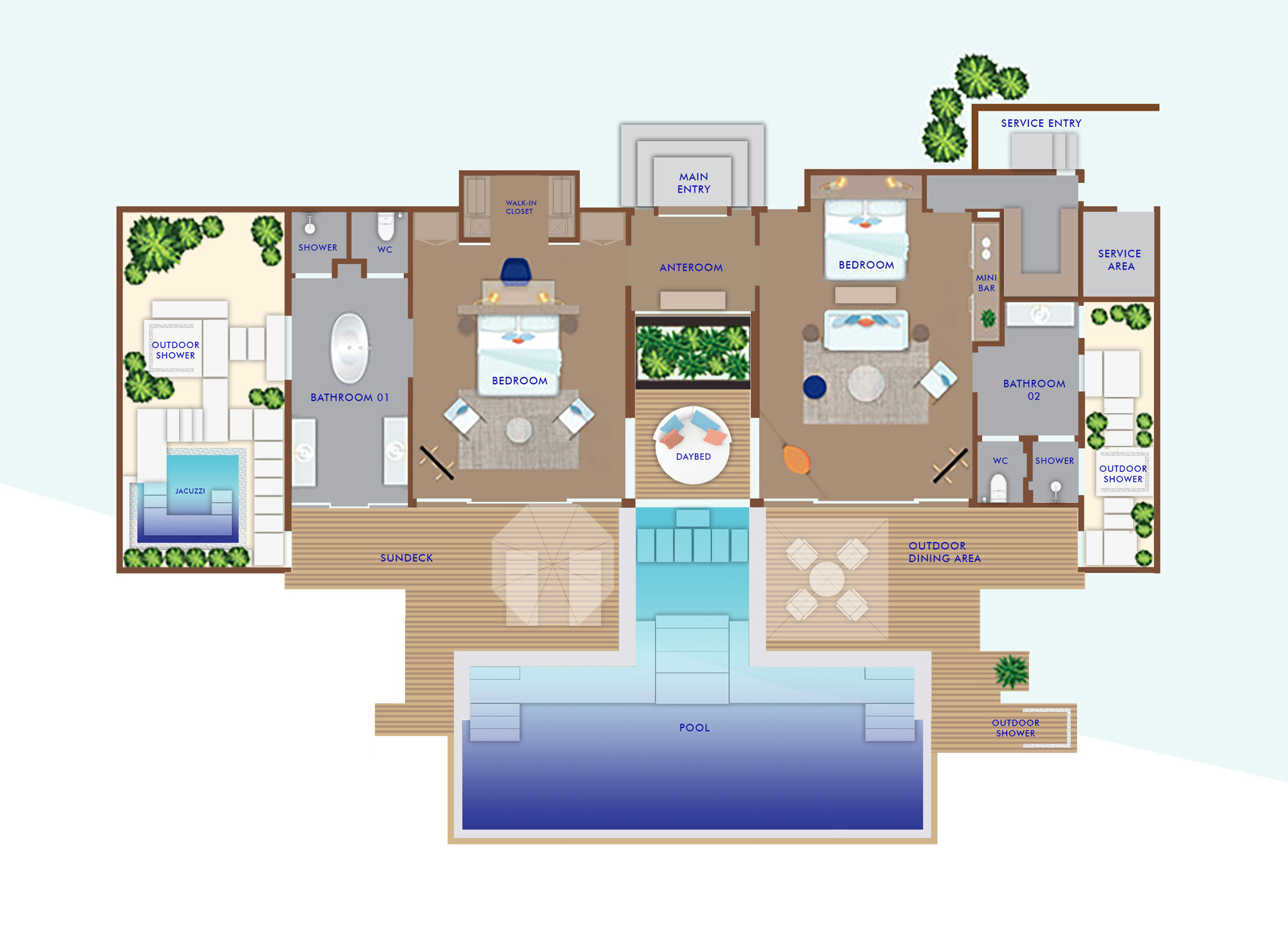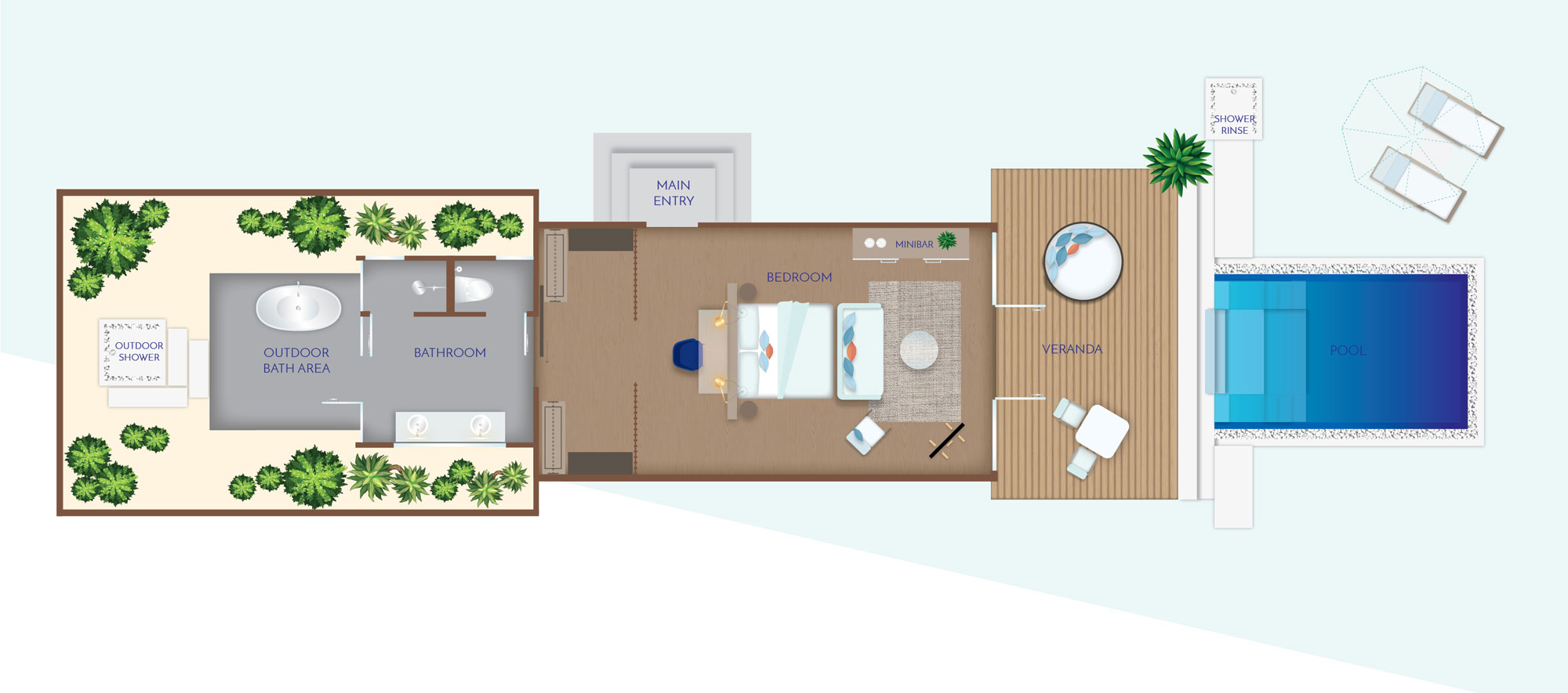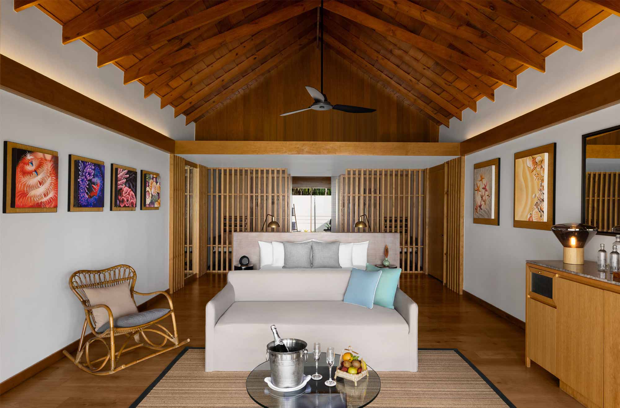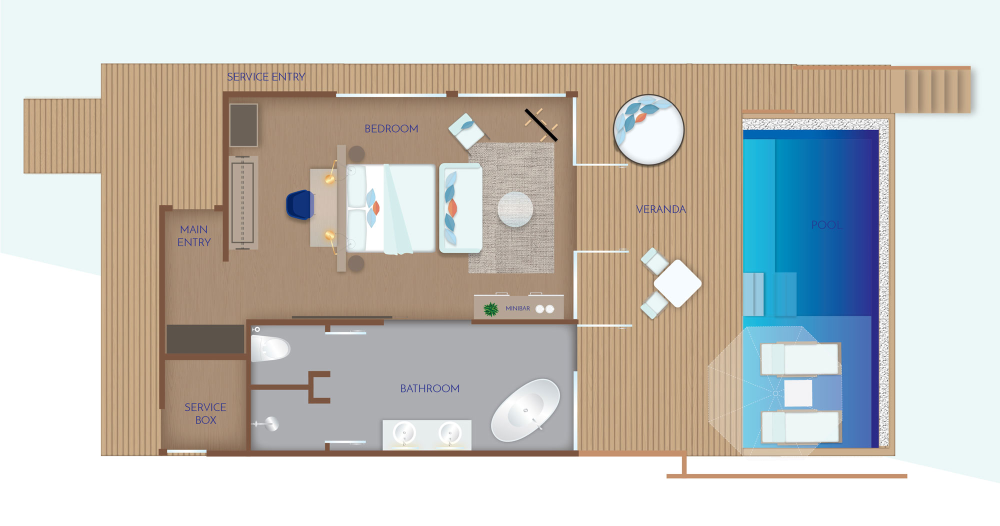 Вилла над водой, с зоной отдыха, спальней, меблированной террасой, собственным бассейном и прямым спуском в воду. Оснащение включает кондиционер, телевизор, телефон, мини-бар, чайник, сейф. Для размещения предлагается кровать размера king-size и диван. В ванной комнате ванна, душ, фен, банные принадлежности, халаты, тапочки.