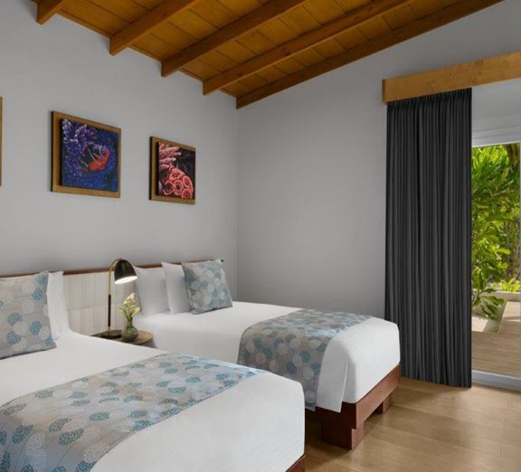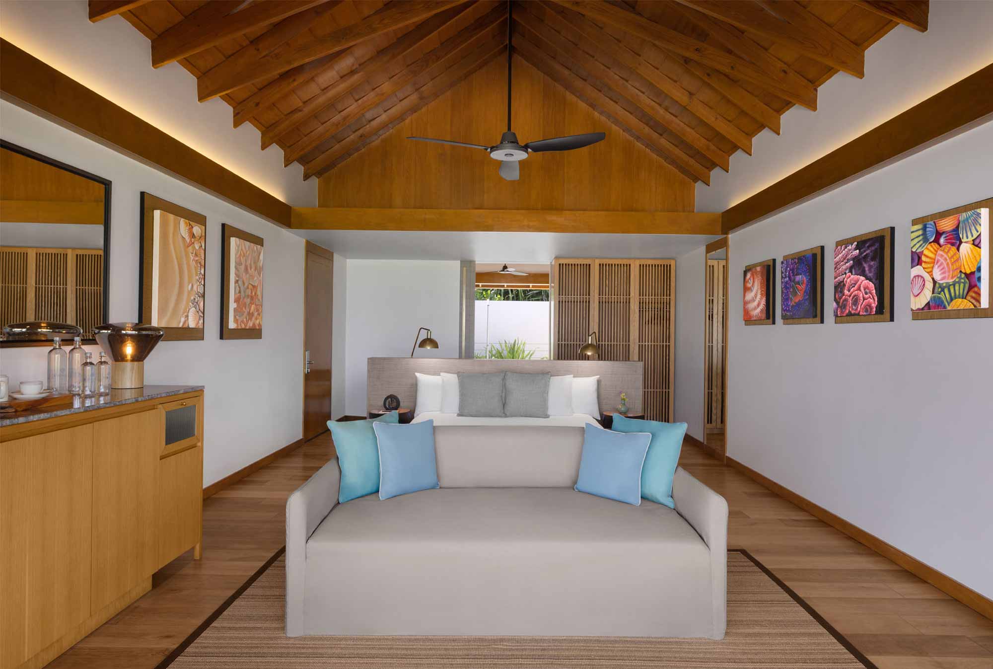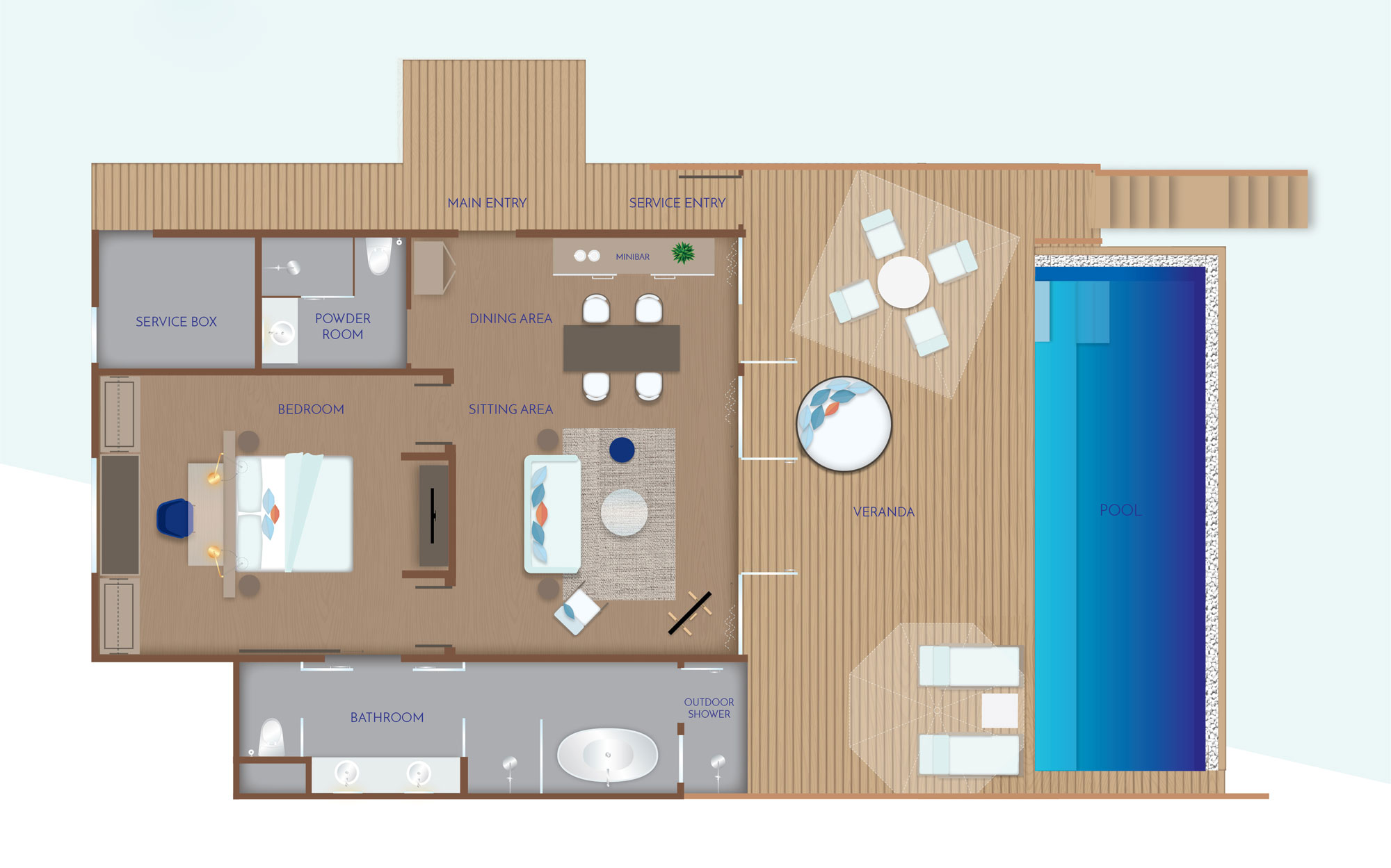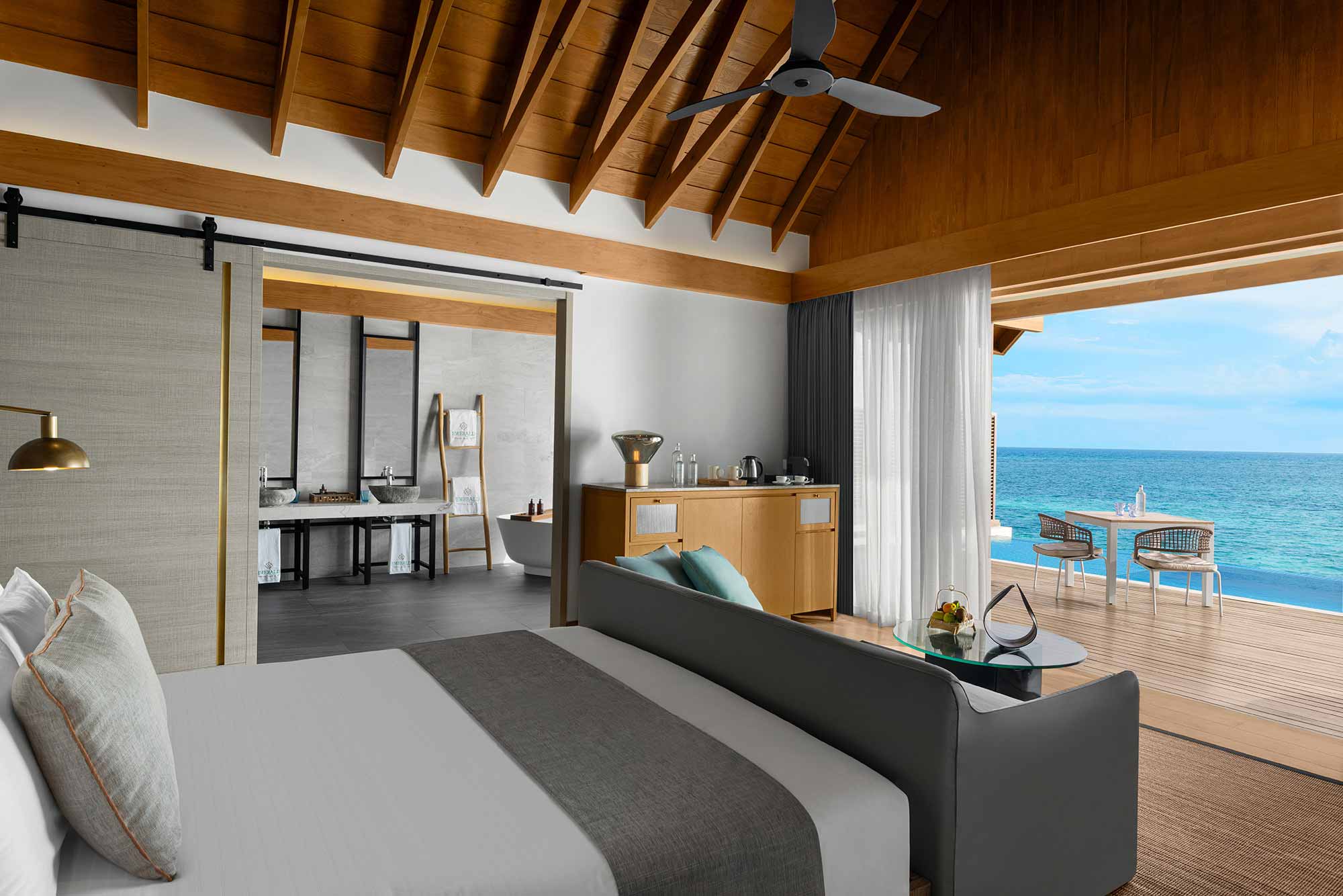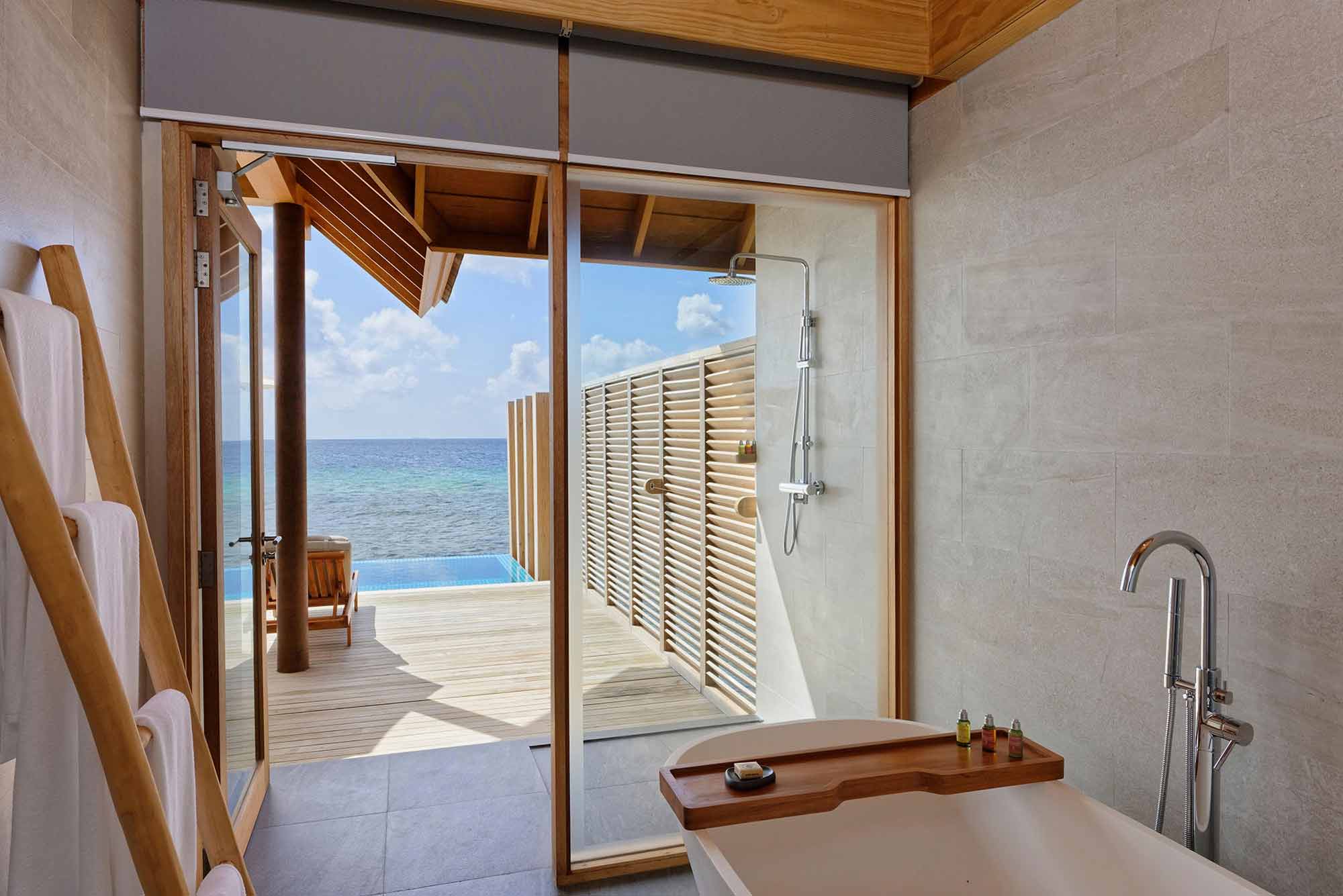 Вилла над водой, с зоной отдыха, спальней, меблированной террасой, собственным бассейном и прямым спуском в воду. Оснащение включает кондиционер, телевизор, телефон, мини-бар, чайник, сейф. Для размещения предлагается кровать размера king-size и диван. В ванной комнате ванна, душ, фен, банные принадлежности, халаты, тапочки.