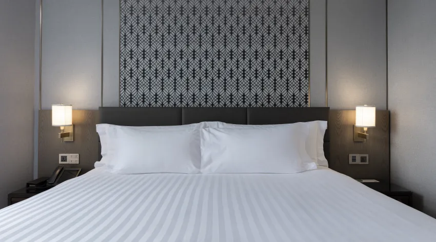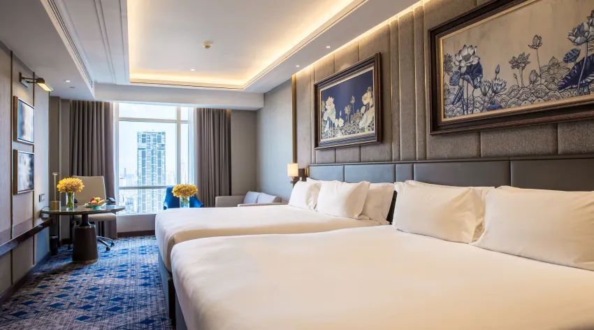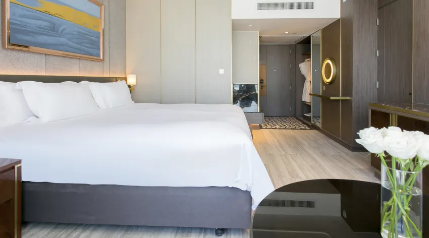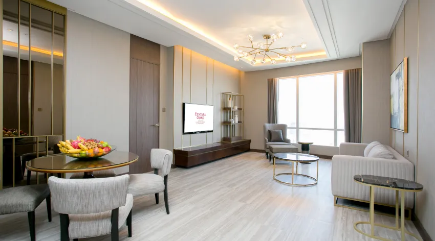 Просторный люкс с большой гостиной, отдельной спальней с двуспальной кроватью king-size и просторной ванной комнатой с большой ванной, из которой открывается вид на городской пейзаж. В номере имеется Wi-Fi, кондиционер, телевизор, мини-бар, сейф, телефон, набор для приготовления чая и кофе, фен, халаты, тапочки и наборы косметики.